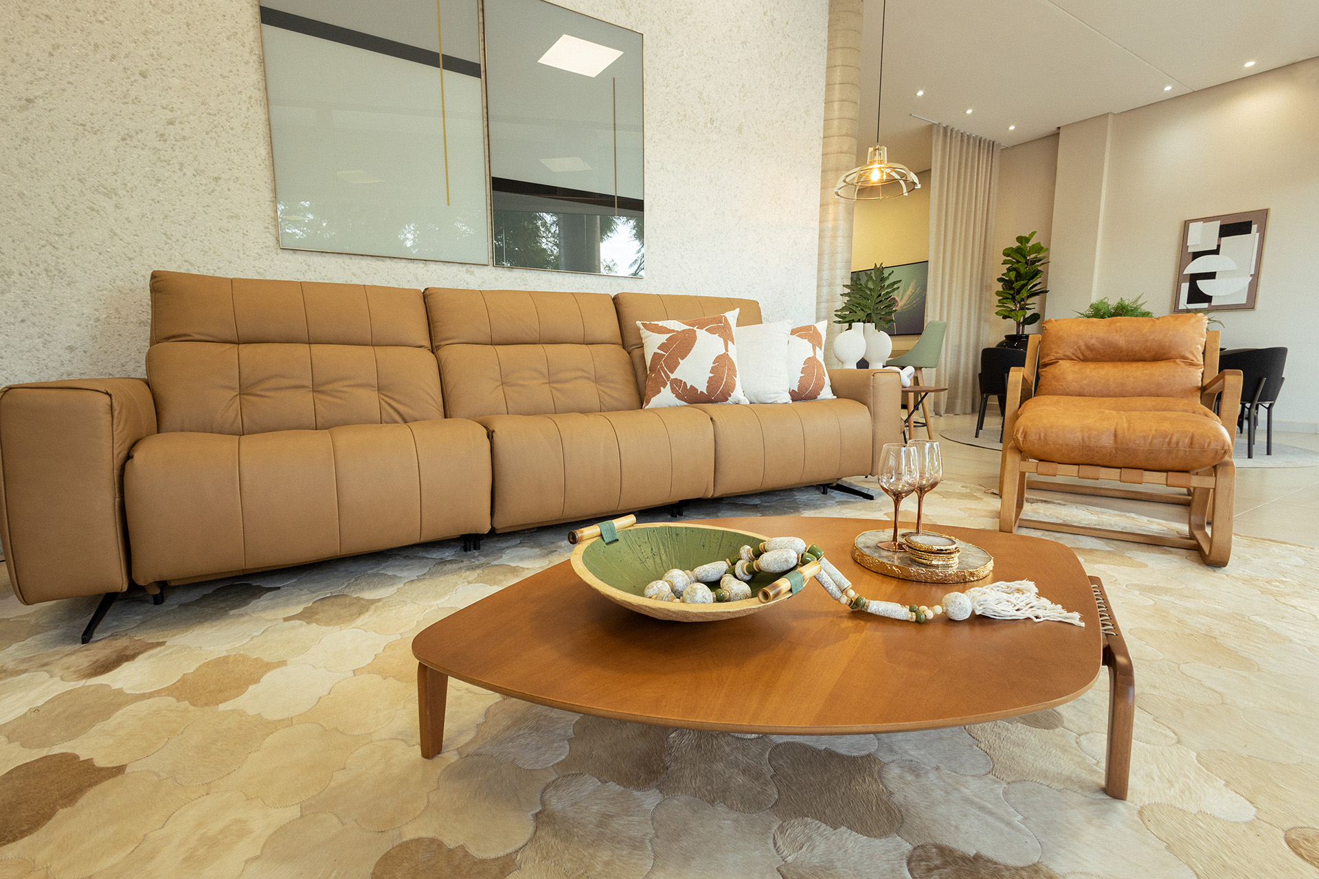 • Sofá Premium Reclinável: Confeccionado em couro legítimo de tonalidade caramelo, este sofá não é apenas uma peça de design; é o seu novo refúgio de relaxamento. Seus módulos reclináveis garantem o conforto ajustável para toda a família, unindo estética sofisticada e funcionalidade.